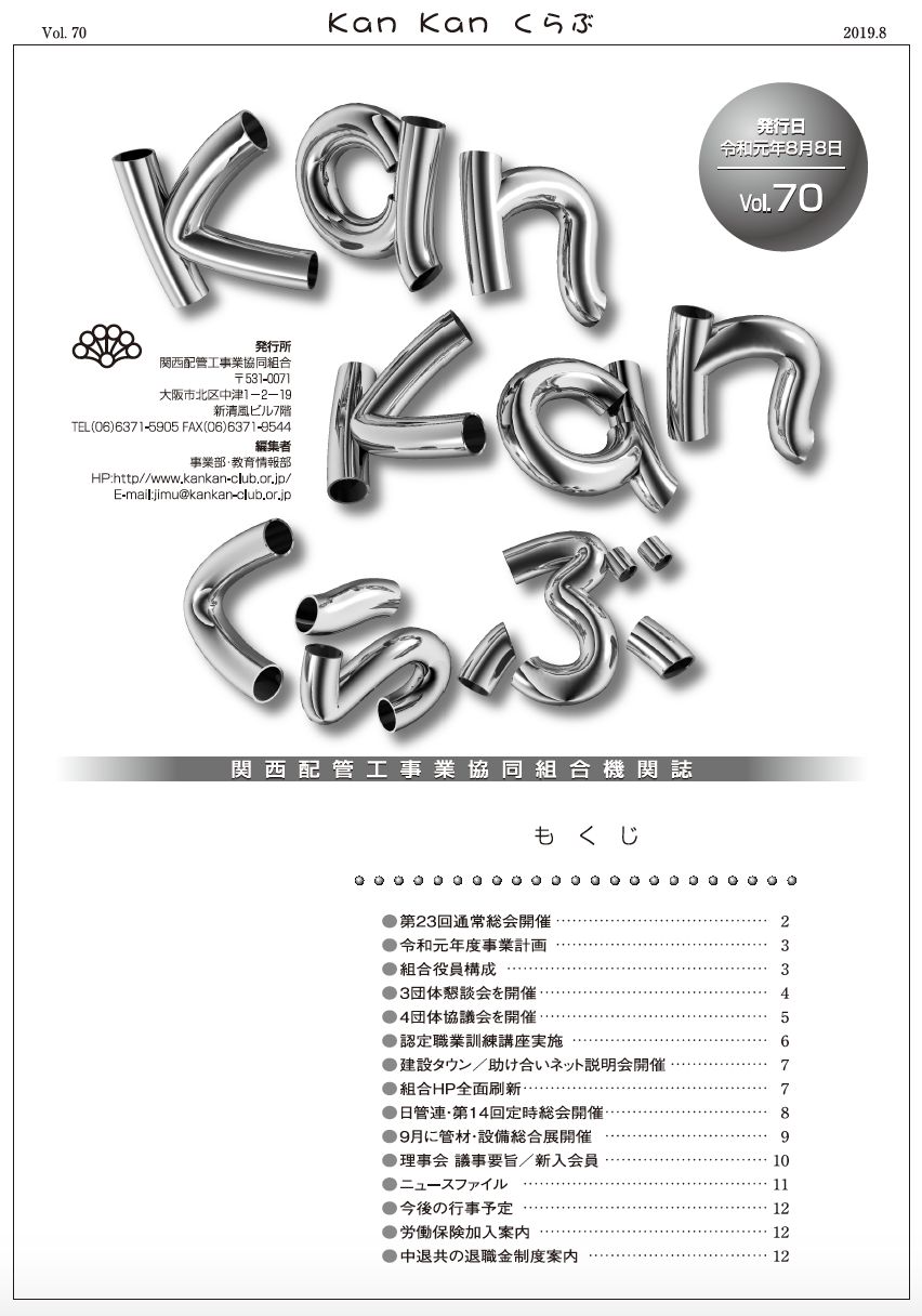 関西配管工事業協同組合が独自に編集・発行している機関誌「Kan Kanくらぶ」。その内容は、組合員はもちろん、配管工事に従事する皆様にとって役立つ情報が目白押し。当組合の活動報告はもちろん、配管工事業に関わる他業種の組合団体との懇談・協議や、大手ゼネコンとの意見交換会の様子、新着ニュースや実技講習のお知らせなどを掲載。配管工事業の今とこれからを掴み、明日を拓くヒントを発信し、好評を博しています。